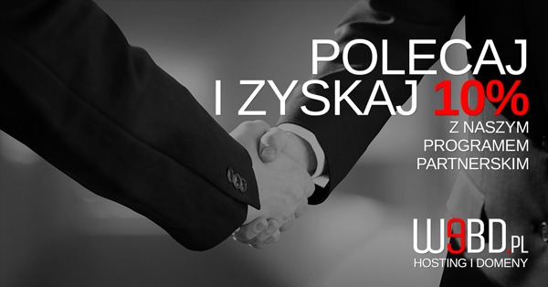 Bycie naszym Partnerem jest proste! Bez ukrytych kruczków! Polecaj hosting w WEBD.pl swoim znajomym, czy partnerom biznesowym – wystarczy, że zakupią usługi za pomocą Twojego indywidualnego partnerskiego linka – i już! 10% ich wpłaty jest na Twoim koncie. Możesz zebrane kwoty wypłacić lub jeszcze lepiej – przeznaczyć na odnowienie lub aktywację kolejnych usług hostingowych w WEBD.pl